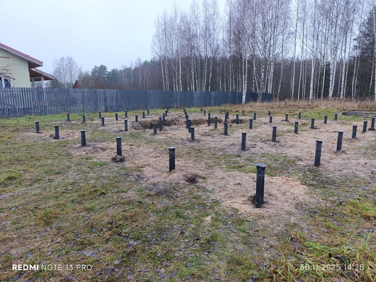 Выравнивание: Все сваи были обрезаны до единого горизонтального уровня. Этот этап необходим для создания идеально ровной плоскости для дальнейшего строительства дома.